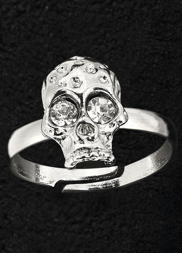 Anel caveira com strass, desenvolvido em metal banhado á prata. Tamanho: Regulável.