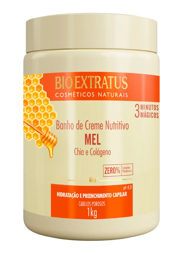 Banho de Creme Mel 1KgOferece intensa hidratação e nutrição para cabelos porosos, preenchendo as falhas da fibra capilar. Mel, chia e colágeno, juntos, repõem umidade, massa e nutrientes em profundidade. Zero% corantes e parabenos. pH 4,0.