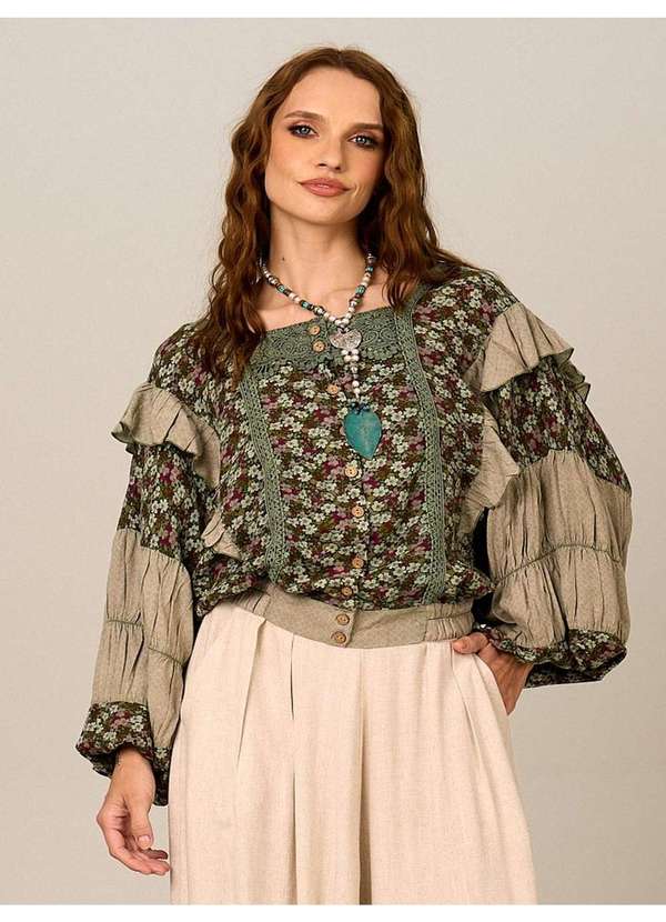 Yacamim - Bata com Mangas Longas Bufantes Verde Estampado Patchwork Patchwork