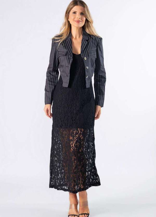 Blazer cropeed risca de giz Dica: Usar com pantalona e croped Composição: 73%algodão 24% poliéster 03%elastano /Forro: 97%poliester 03%elastano Modelo usa: Tamanho P - Medidas 1,75 de altura | 60kg.