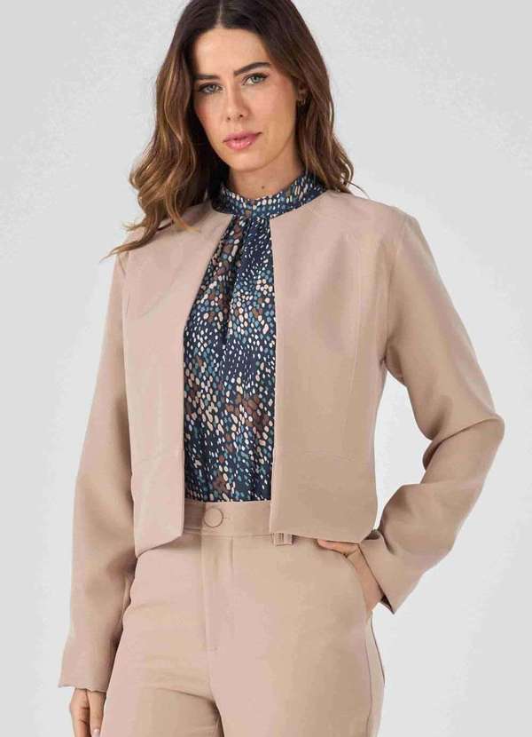 Blazer confeccionado em tecido plano alfaiataria, cor bege, com ótimo caimento e toque macio, não possui transparência e não amassa com facilidade. A peça possui modelagem em alfaiataria, caimento reto, forro interno, mangas longas, decote redondo, não possui fechamento, comprimento curto e acabamento pespontado. Blazer é uma peça clássica e atemporal no guarda roupa feminino, perfeito para compor looks elegantes e sofisticados, seja no trabalho ou para uma produção mais formal ou até mesmo casual. Combine com a calça da mesma coleção para um conjunto monocromático perfeito.