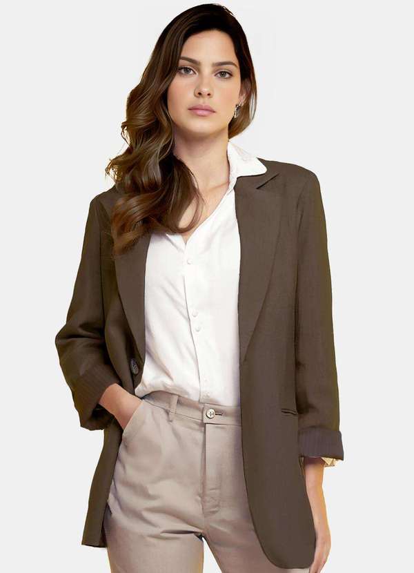 Detalhes: Blazer feminino de vicose lisa sarjada. Peça forrada por inteiro, em tecido liso, com ombreiras finas para estruturar os ombros. Fechamento frontal com 1 botão marmorizado. Tecido texturado peso médio, macio. Modelagem alongada, cobre o quadril, com mangas levemente mais soltas para usar dobrada. Bolsos frontais verdadeiros. Para peças de alfaiataria, os bolsos vem fechados na costura para não deformar, desfaça a costura delicadamente.