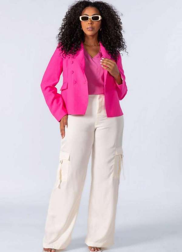 Blazer com botões. A peça contém modelagem clássica, mangas longas com ombreiras, gola clássica, bolsos fake e fechamento frontal com botões. Dica: Use com bermudas, calças ou até mesmo com saias midi para um visual moderno e elegante. Composição: 92% Viscose | 08% Poliéster. Forro: 100% Acetato. Modelo 1: Tamanho P - Medidas 1,75 de altura | Manequim 38. Modelo 2: Tamanho G - Medidas 1,73 de altura | Manequim 44.