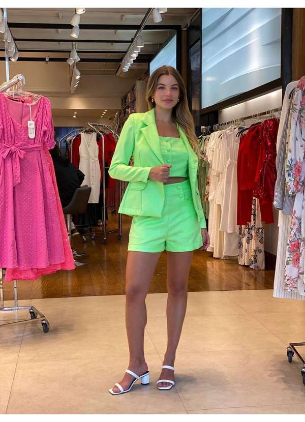 Um blazer de fios metalizados com botões forrados e ombreiras seria uma peça de vestuário elegante e sofisticada. Aqui está uma descrição mais detalhada desses elementos: Fios Metalizados: Os fios metalizados são fios de tecido que contêm um filamento metálico, como prata ou ouro, incorporado ao tecido. Isso cria um efeito brilhante e cintilante no blazer, tornando-o ideal para ocasiões especiais ou eventos noturnos. Botões Forrados: Os botões forrados são botões que são cobertos com o mesmo tecido que o blazer. Isso cria uma aparência uniforme e elegante, pois os botões se misturam ao tecido em vez de contrastar com ele. Isso é uma característica de alta costura e é frequentemente encontrada em peças de roupa de qualidade. Ombreiras: As ombreiras são almofadas estrategicamente posicionadas nos ombros do blazer para criar uma forma mais estruturada e definida. Elas podem adicionar um toque de sofisticação ao visual e também podem ajudar a melhorar a postura. Em resumo, um blazer com fios metalizados, botões forrados e ombreiras é uma escolha elegante e chique para ocasiões especiais ou para quem procura uma peça de roupa que chame a atenção pela sua sofisticação e estilo. TECIDO: TWEED LINEN Composição: 50% ALGODÃO 50% POLIESTER Cuidados: Lavagem suave a mão; Não usar alvejante a base de cloro; Não usar secadora; Estender na vertical sem torcer; Não passar ferro; Não fazer limpeza a seco. Feito no Brasil CNPJ. 22.759.307/0001-03