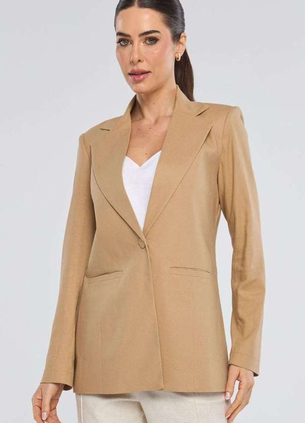 Blazer confeccionado em tecido plano de linho com viscose, cor natural bege, possui elastano em sua composição, textura natural e respirável, que proporciona conforto ao vestir e toque macio, não possui transparência. Modelagem com estilo clássico da alfaiataria, corte reto, caimento alinhado ao corpo, comprimento intermediário, gola tradicional com lapela estruturada, forro interno, bolsos frontais funcionais, mangas longas, acabamento pespontado e fechamento frente por botão forrado. Possui ombreiras, garantindo uma estrutura perfeita ao vestir. O blazer de linho na cor bege é uma peça essencial no guarda-roupa feminino, ideal para mulheres que valorizam estilo, conforto e praticidade. Com modelagem impecável em alfaiataria e acabamento sofisticado, ele une o charme da moda clássica à leveza do linho, proporcionando um visual elegante em qualquer estação, compondo looks formais ou casuais com personalidade. Para uma proposta monocromática moderna, combine com a calça ou saia da mesma coleção e crie produções minimalistas cheias de estilo.