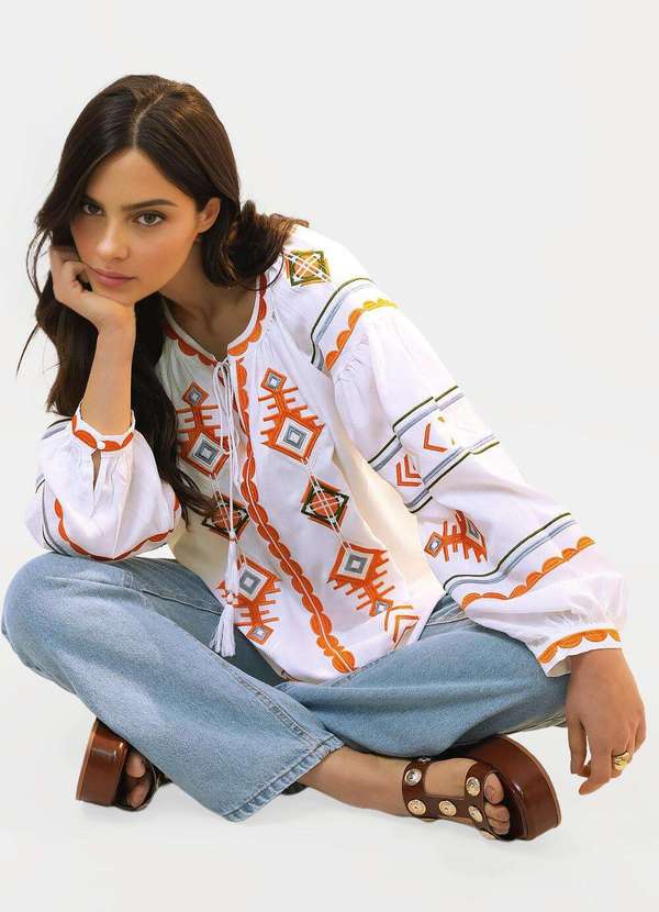 Detalhes:Blusa branca bordada com manga longa. Decote canoa com acabamento bordado, pequeno V no final, acabamento em revel e pingente de chuveiro de algodão. Mangas raglã bordadas, com recorte na parte superior e acabamento em punho bordado com botão delicado. Barra reta solta. Tecido em 100% viscose, plano. Bordado colorido em laranja intenso, branco, azul acinzentado e verde militar. Tecido fresco e suave.