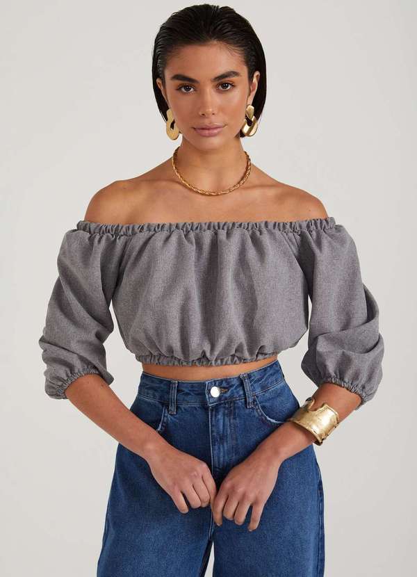 Dimy - Blusa Cropped Ciganinha Manga Bufante Dimy Cinza