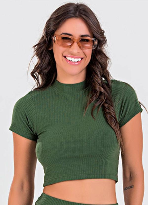 Meu Jeans - Blusa Cropped Gola Alta Canelada Verde Militar