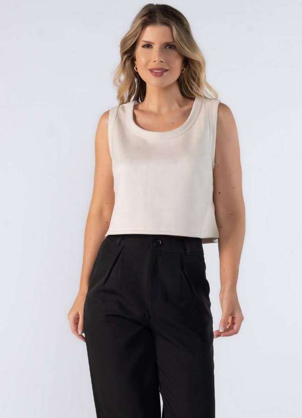 Regata cropped de suede Dica: Usar com calça pantalona Composição:97% poliéster 3%poliester Modelo usa: Tamanho P - Medidas 1,75 de altura | 60kg.