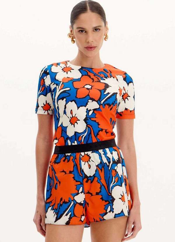 Com estampa floral vibrante, a blusa de mangas curtas e gola redonda é perfeita para a estação. O fechamento posterior por botão traz um toque especial, enquanto o caimento confortável proporciona liberdade de movimento. Combine com jeans e arrase!