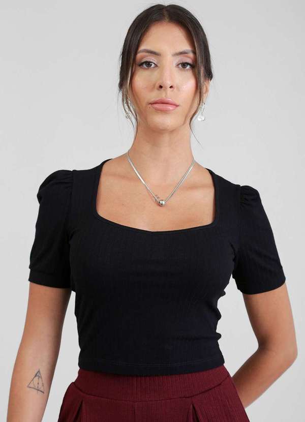 Pop Me - Blusa em Malha Canelada Manga Curta Preto
