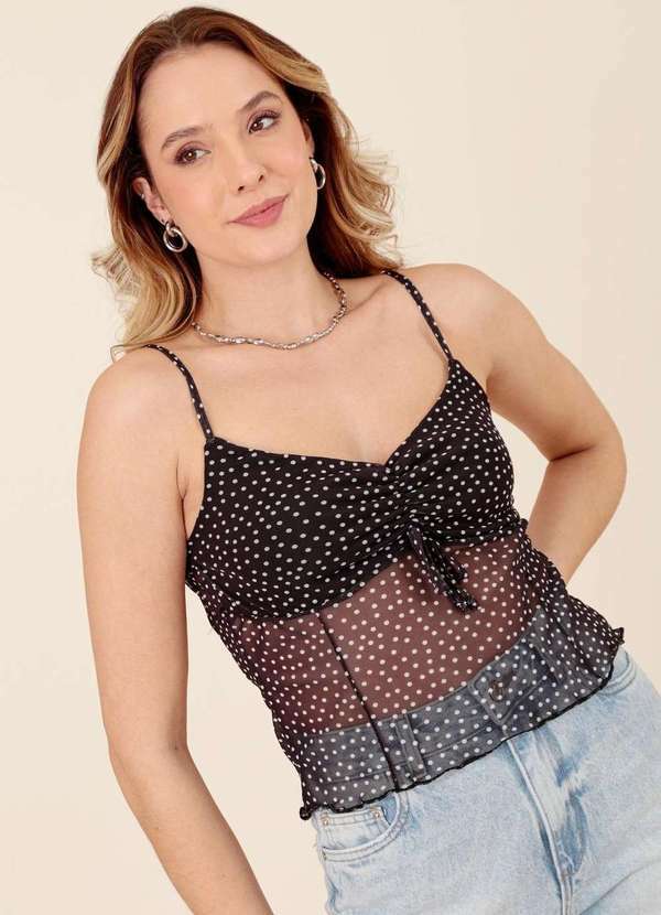 Pop Me - Blusa em Tule Poa com Alca e Busto Franzido Preto