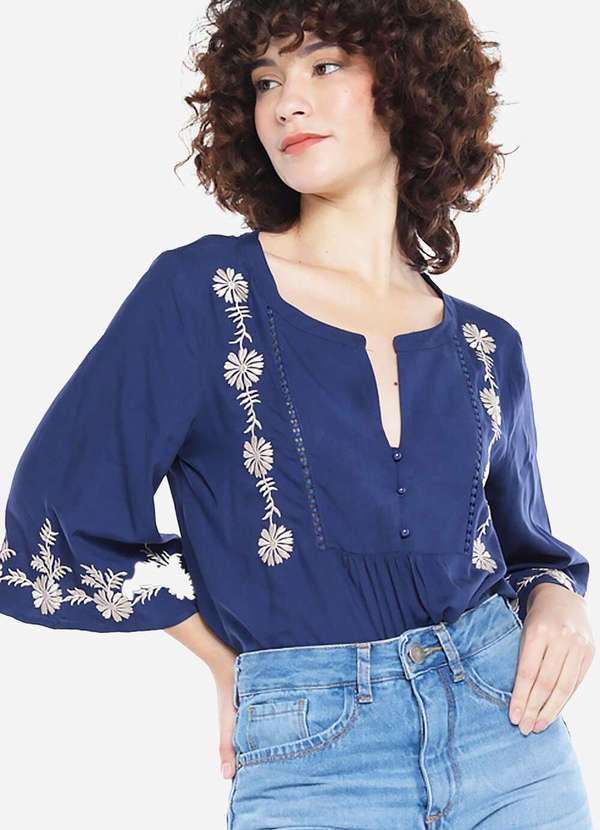 Sob - Blusa em Viscose Mangas Bordada Boho - Azul