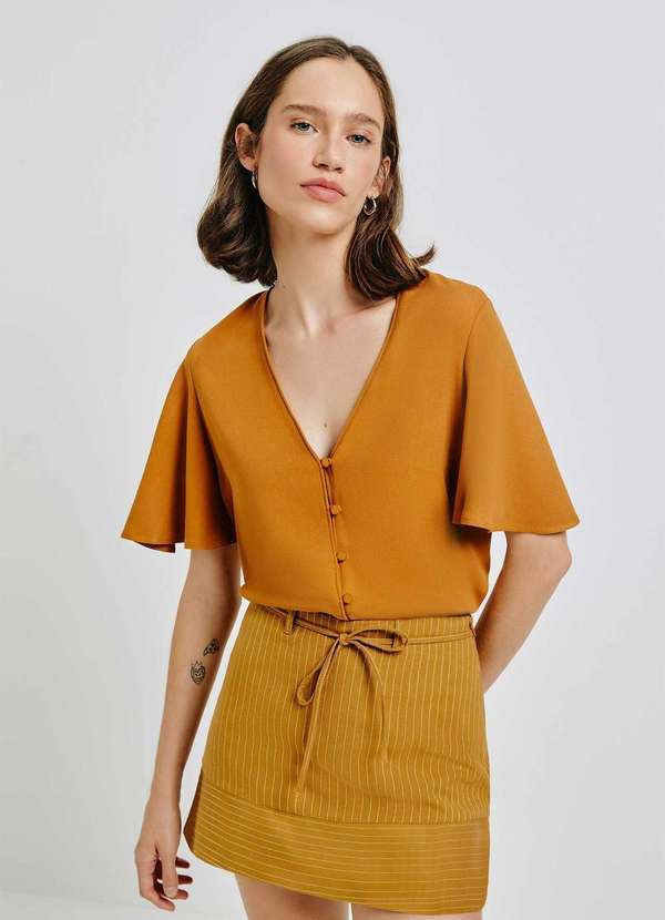 Blusa feminina elaborada em tecido de viscose super leve. Com margas morcego fluídas e vista com botões, é perfeita para criar looks versáteis e sofisticados. Detalhes da peça: Em tecido Modelagem regular Manga curta Decote V Vista com botões Barra arredondada