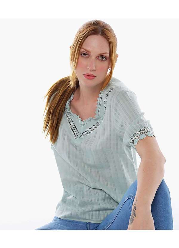 Sob - Blusa Feminina em Algodão Maquinetado Verde Clara com Renda Sob - Verde