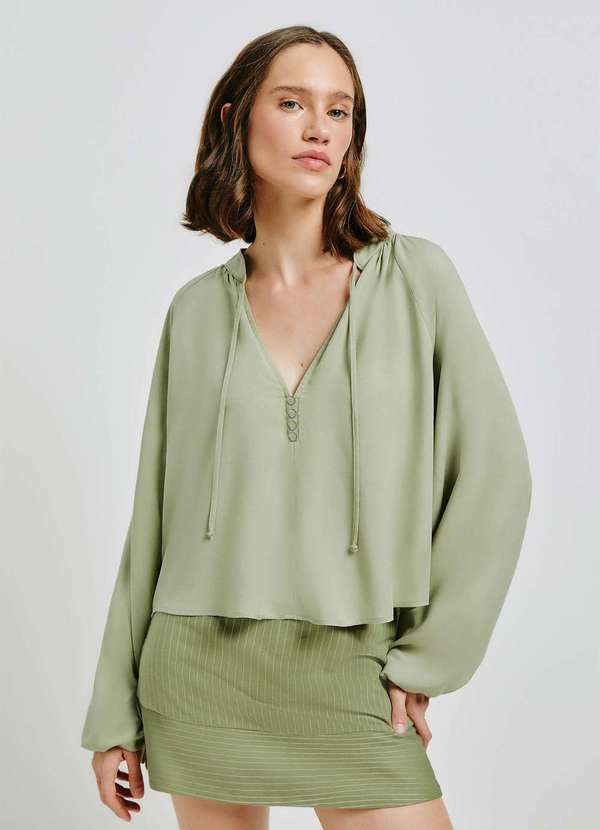 Blusa feminina manga longa elaborada em tecido leve e fluído de viscose e linho. Com design tipo bata e caimento soltinho, oferece versatilidade para qualquer ocasião, seja casual ou mais sofisticada. Aposte! Detalhes da peça: Em tecido Modelagem regular Manga longa bufante Gola padre com cordão Decote V com botões