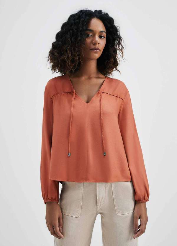 Blusa feminina manga longa em viscose creponada, tecido encorpado com toque leve e macio. Possui um decote V com detalhes franzidos e friso para amarração, ideal para compor looks elegantes com conforto de sobra. Detalhes da peça: Em tecido Modelagem regular Decote V com friso Manga longa fluída Punhos com elástico Fenda na lateral da barra