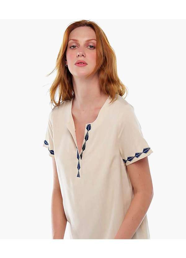 Sob - Blusa Feminina Textura de Linho Manga Curta Bordada Bege