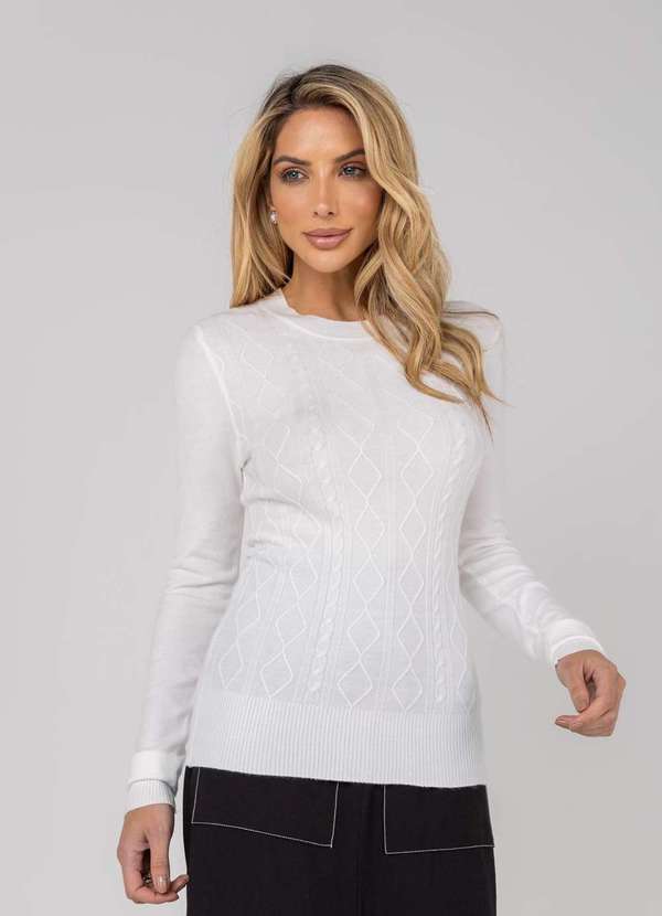 Salvatore Fashion - Blusa Feminina Tricot Gola Careca Tramas Branco