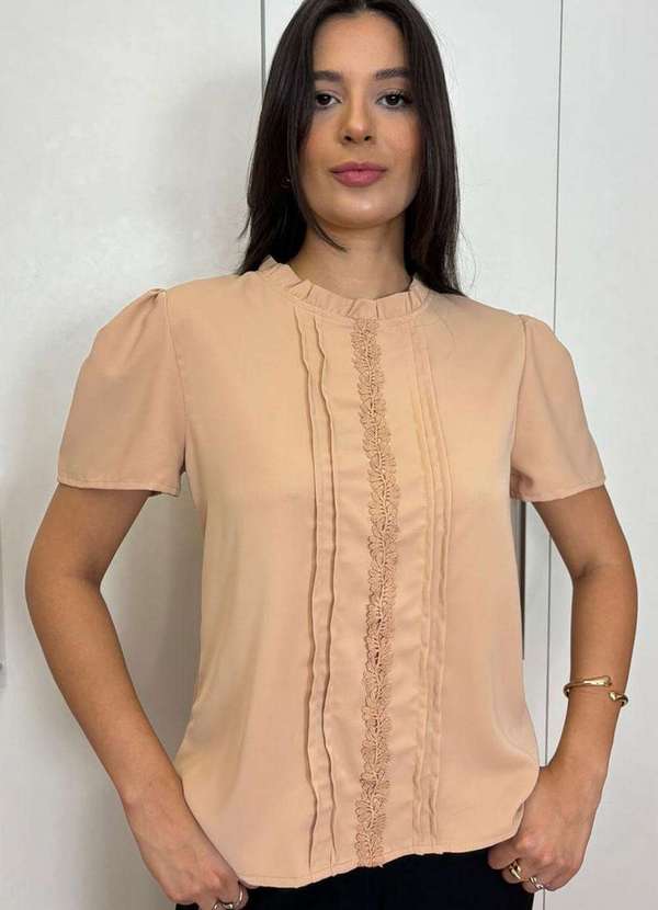 Blusa Kim Manga Manga Curta Com Detalhe Gripir, blusa com gola franzida, detalhe em gripir, manga curta e botão posterior ecapado no mesmo tecido. A blusa Kim detalhe em gripir e a gola franzida trazem um toque delicado e sofisticado, tornando a peça ideal para diversas ocasiões, desde o trabalho até eventos sociais. O crepe com toque de seda oferece uma sensação suave na pele, garantindo conforto ao longo do dia. Com design delicado e elegante, pode ser combinada facilmente com saias, calças ou até shorts, sendo uma peça curinga para diferentes estilos e ocasiões. O tecido de crepe é leve e fluido, proporcionando um caimento solto que valoriza a silhueta sem prender os movimentos. O crepe é conhecido por ser um tecido que não amassa facilmente, o que facilita os cuidados e a manutenção da peça. O crepe é um tecido resistente, garantindo que a blusa mantenha sua forma e aparência por muito mais tempo. O toque de seda dá um acabamento levemente brilhante e elegante, elevando o look.: Mesmo sendo uma peça que aparenta sofisticação, o crepe com toque de seda é um tecido que permite a respiração da pele, ideal para dias mais quentes. Tecido: Crepe com toque em seda Composição: 95% Poliester 5% Elastano Cuidados: Lavar a temperatura maxima de 40°; Não usar alvejante a base de cloro; Não usar secadora; Temperatura máxima do ferro 110°; Fazer limpeza a seco com profissional; Feito no Brasil
