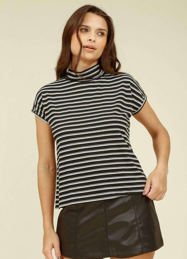 Pop Me - Blusa Malha Listrada Manga Curta com Gola Alta Preto