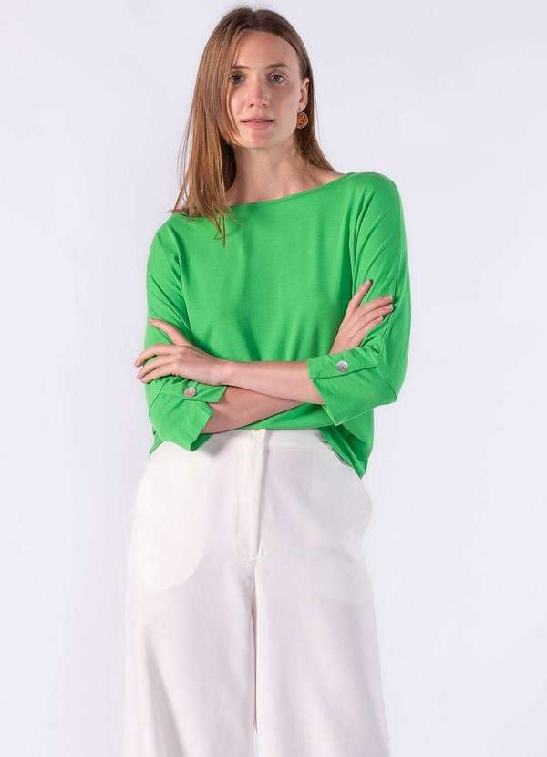 Blusa ampla manga morcego com detalhe em botão na manga Dica: Usar com pantalona Composição: 95,5%viscose 4,5%elastano Modelo usa:Tamanho P - Medidas 1,78 de altura | 55kg.