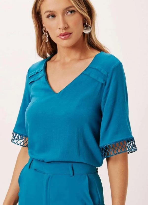 Dimy - Blusa Manga Curta com Entremeio Tecido Plano Feminino Dimy Azul