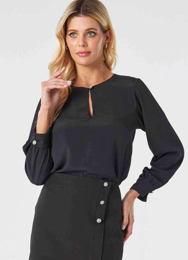 Blusa confeccionada em tecido crepe chiffon cor preta, com toque macio e excelente caimento, que não amassa com facilidade. Possui shape solto, caimento reto, decote redondo com detalhe de abertura e fechamento por botão jóia, mangas longas com leve franzimento finalizadas com punhos e abotoamento por botões jóia, acabamento pespontado. Blusa perfeita para deixar sua produção elegante com um toque de sofisticação. Ideal para as mais diversas ocasiões, como reuniões, happy hour ou eventos mais formais. Você ficará bem vestida sem muito esforço, podendo facilmente combinar esta peça com calça alfaiataria para um visual mais clássico, ou saia e shorts para um visual mais casual.