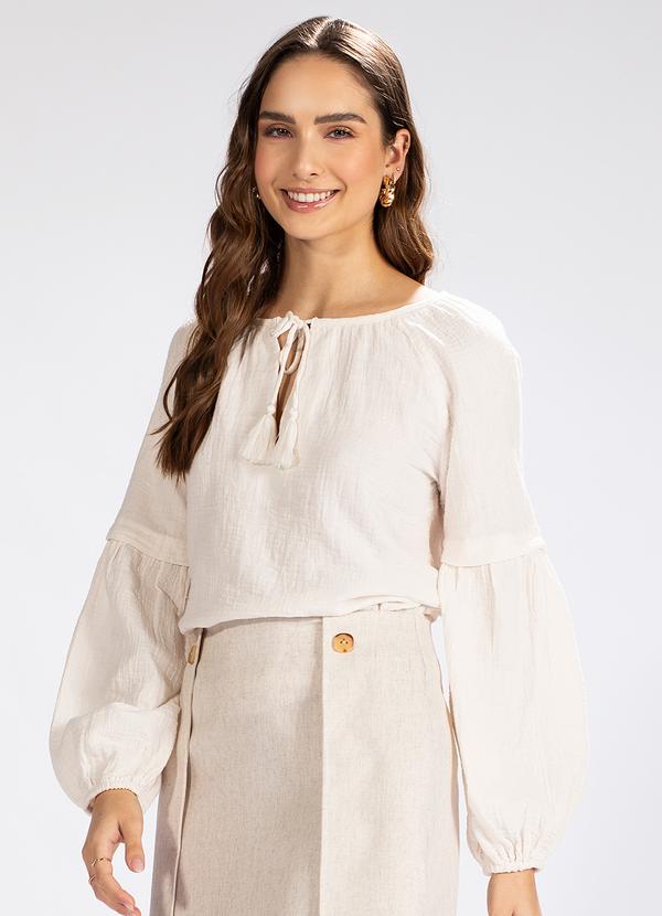 Blusa manga Longa em malha, decote V com detalhe para amarração com tassel na ponta, elástico no pungo