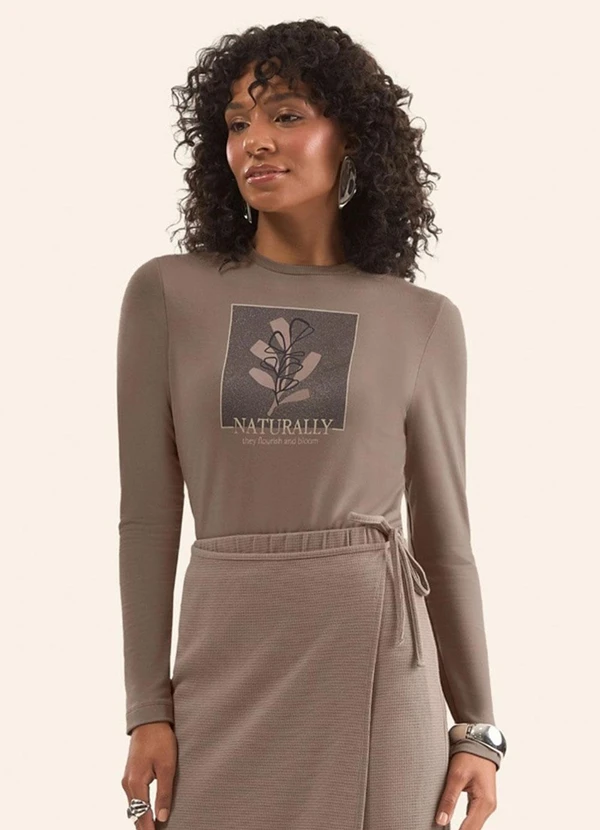 Rovitex - Blusa Manga Longa Estampada Marrom