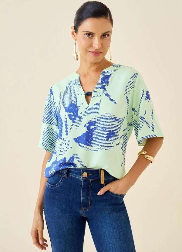 Maria.valentina - Blusa Maria.Valentina Solta Decote V Manga Curta Padrão Azul Mari Azul