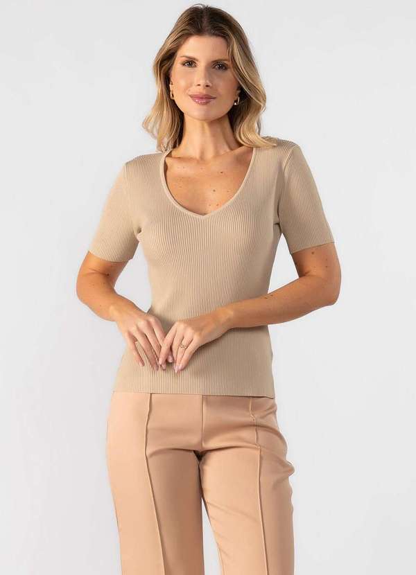 Blusa canelada manga curta decote em V Dica: Usar com saia midi e scarpin Composição: 50%viscose 50%poliamida Modelo usa:Tamanho P -Medidas 1,75 de altura | 60kg.