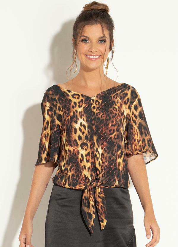 Quintess - Blusa Onça Marrom com Amarração na Barra
