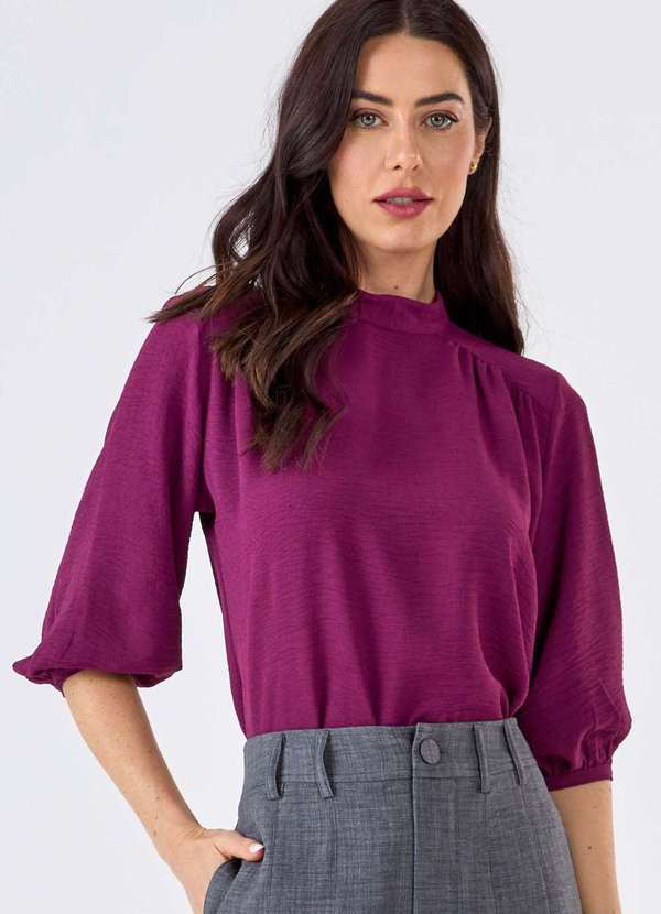 Blusa confeccionada em tecido com superfície levemente texturizada, cor magenta, com toque macio, excelente caimento e fluidez, não possui transparência e não amassa com facilidade. Possui modelagem soltinha, que valoriza os diversos biótipos femininos, shape reto, decote redondo, fechamento posterior por botão, recorte nos ombros com leve franzimento, manga 7/8 finalizadas com punho, comprimento tradicional e acabamento pespontado. Blusa em tom magenta, uma cor vibrante e cheia de energia, é sofisticada e elegante, combina com tons neutros, como preto, bege, off white e cinza. Experimente coordená-la com calças em alfaiataria para um visual mais elegante ou equilibre as formas com saias midis para uma produção marcante com estilo.