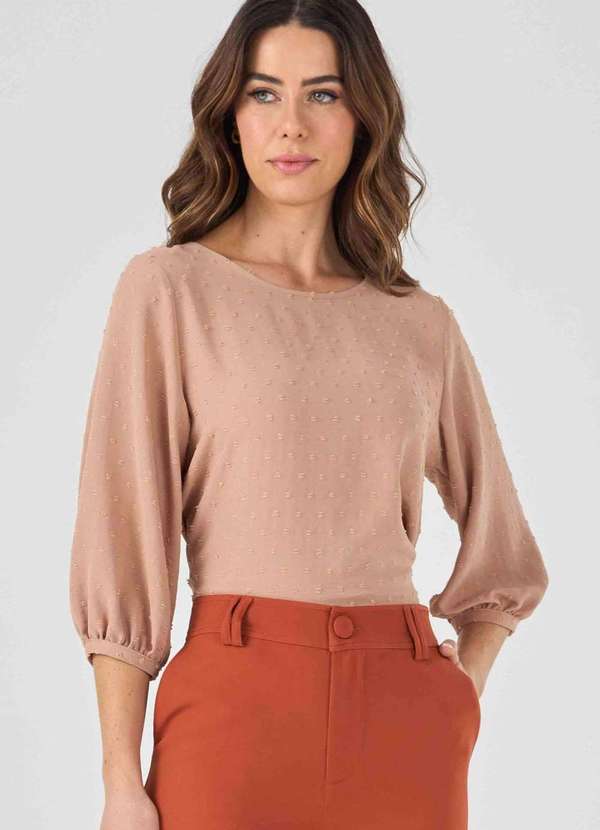Blusa confeccionada em tecido leve com superfície texturizada de padronagem poá, cor bege, com toque macio, excelente caimento e que não amassa com facilidade. A peça possui shape solto, caimento reto, decote redondo, mangas 7/8 finalizadas com punho e acabamento pespontado. Blusas na cor bege são essenciais no guarda roupa feminino. São clássicas e atemporais, o que garante produções versáteis para as mais diversas ocasiões, seja no trabalho, passeio ou happy hour.