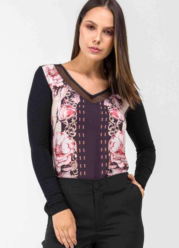 Pks - Blusa Pks Manga Longa Decote V Tule Frente Estampada Preto