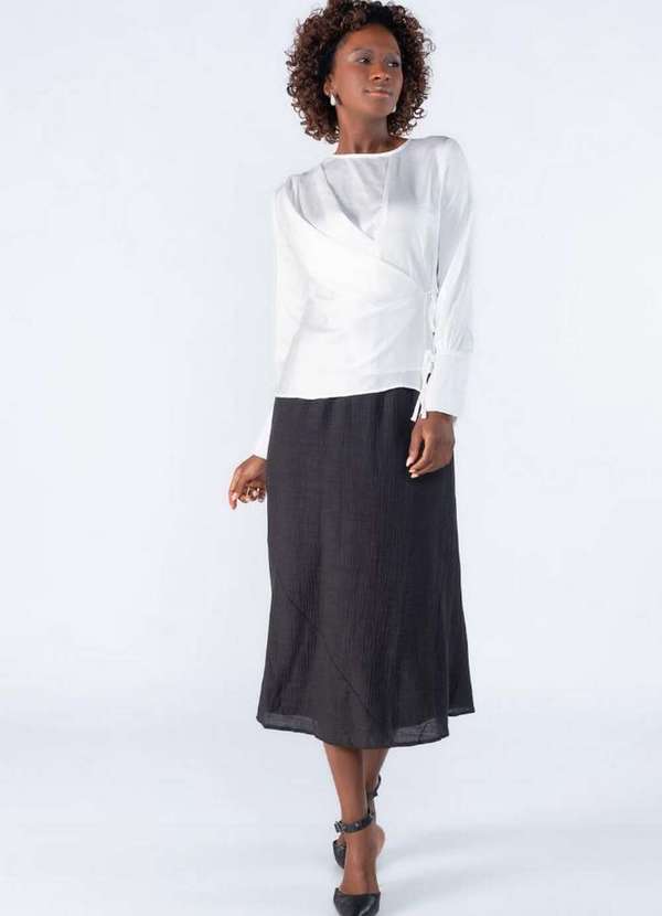 Blusa acetinada manga longa com detalhes transpassado e amarração fechamento posterior em botão Dica: usar para looks formais com calça reta ou pantalona Composição: 100%poliester Modelo usa: Tamanho P - Medidas 1,75 de altura | Peso: 59kg