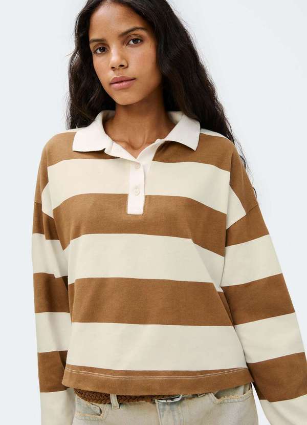 Blusa polo manga longa em malha binada mais encorpada, proporcionando um bom caimento para a peça. Possui estampa rotativa listrada, vista com botões, cavas deslocadas e shape mais boxy, solto do corpo. Conta com fenda nas laterais com costas maior que frente e etiqueta de enfeite acima da barra no lado esquerdo. Estilo e conforto de sobra! Detalhes da peça: Malha binada Modelagem box Manga longa Gola polo Fenda nas laterais Etiqueta na barra
