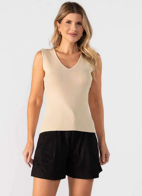 Blusa regata canelada decote V Dica: Usar com calça pantalona e scarpin Composição: 50%viscose 50%poliamida Modelo usa:Tamanho P -Medidas 1,75 de altura | 60kg.