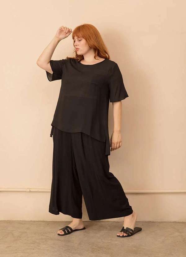 Blusa em tecido tecnológico plus size. Modelagem ampla e evasê. Decote redondo. Mangas soltinhas Fendas laterais com as costas levemente mais comprida. Bolsinho no busto. Tecido com leve transparência. Tecido com leve transparência. Observação: Essa peça passou por processo de lavagem e não sofrerá encolhimento. Sugerimos lavar essa peça em água fria e à mão. Se optar pela máquina, use o modo delicado. Isso irá garantir bons resultados finais e uma maior durabilidade da sua peça. Não usar secadora. Não aceitamos devoluções de peças usadas. Medidas: G equivale 48-50 GG equivale 50-54 EXG equivale 56-58 EXGG equivale 58-60 Busto 120cm 128cm 136cm 144cm Cintura 130cm 138cm 146cm 154cm Quadril 144cm 152cm 160cm 168cm Comprimento Frente 70cm 72cm 74cm 76cm Comprimento Costas 80cm 82cm 84cm 86cm Largura da manga 50cm 54cm 58cm 62cm