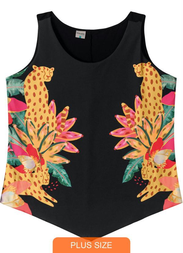 Malwee Plus - Blusa Tropical em Cetim Plus Preto