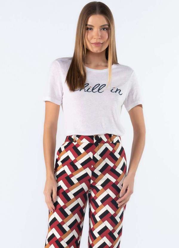 Blusa básica leve com bordado Chill in com strass Dica: Usar com calça de alfaiataria e mocassim Composição: 79%viscose 14%linho 07%poliester Modelo usa:Tamanho P - Medidas 1,75 de altura | 62kg.
