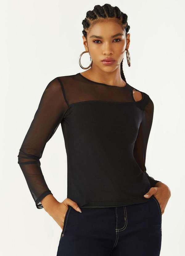 Zinco - Blusa Zinco Ajustada Decote Careca Manga Longa Padrão Preto Preto