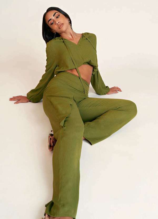 Zinco - Blusa Zinco Cropped Decote V Manga Longa com Amarração Verde Verde
