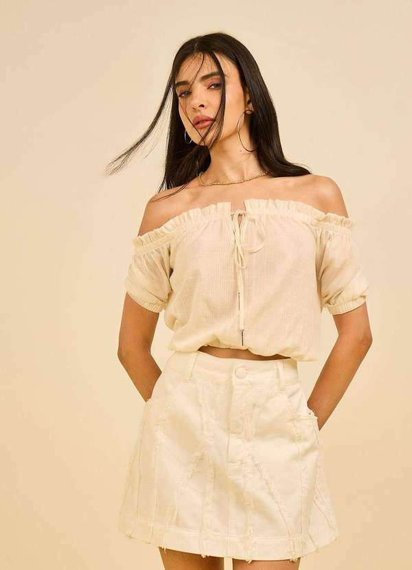 Zinco - Blusa Zinco Solta Ombro a Ombro Manga 7 Oitavos Padrão Off White Branco