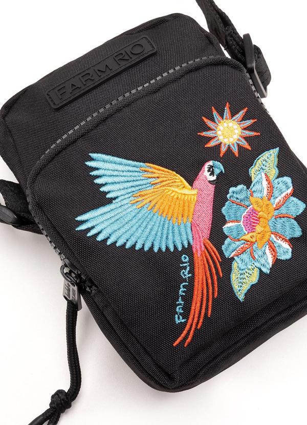 Bolsa FARM Rio preta com bordado colorido de arara, flores e sol. Possui alça ajustável, bolso frontal com zíper e visual vibrante. Ideal para levar o essencial com estilo e praticidade no dia a dia. Comprimento 17 cm x Largura 12 cm x Profundidade 3 cm.