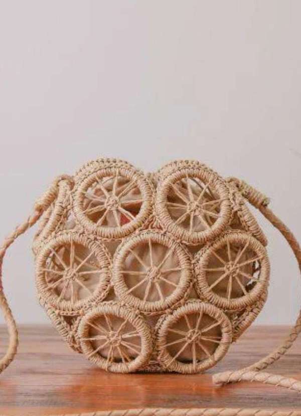 Bolsa redonda, artesanal, vazada e com forro neutro que traz mais segurança para carregar seus pertences. A alça é em couro sintético, trazendo mais sofisticação a bolsa.Fechado pelas cordas. Medidas: 23x7,5x22 cm