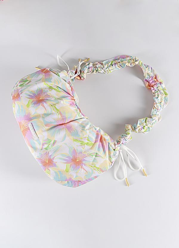 Bolsa com estampa floral tropical em tons suaves, alça franzida com elástico para ajuste confortável e visual único. Modelo leve e versátil para completar looks com charme e praticidade.