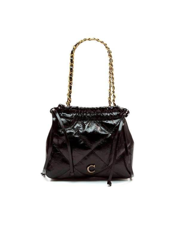 Bolsa estilo handle bag confeccionada em couro matelassê, combinando elegância e modernidade. Apresenta alça de corrente entrelaçada em couro, abertura drapeada por tiras de couro e fechamento por ímã. Conta com espaço interno ideal para itens do dia a dia e uma alça transversal opcional para maior versatilidade. Um acessório sofisticado e funcional para compor seus looks. Características Material: Couro ( Verniz Glosssy ) Cor: Preto Medidas Aprox.: Alt: 18,0cm Larg: 20,0cm Prof: 8,0cm.