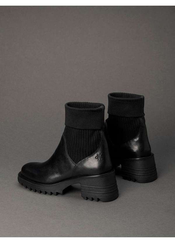 Bota Calvin Klein Jeans feminina, cano médio de couro e meia de tecido knitting, queima baixo relevo exclusivo da marca.